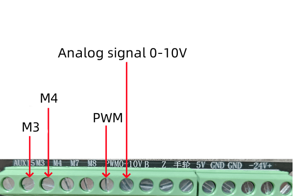 If you have a standard spindle (i.e., controlled only through a power switch), please refer to the relay control at the output port and use the M3 spindle switch port for control.